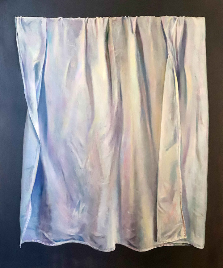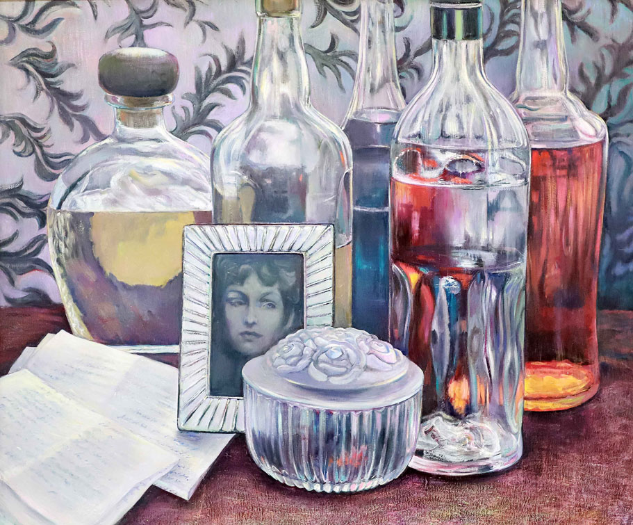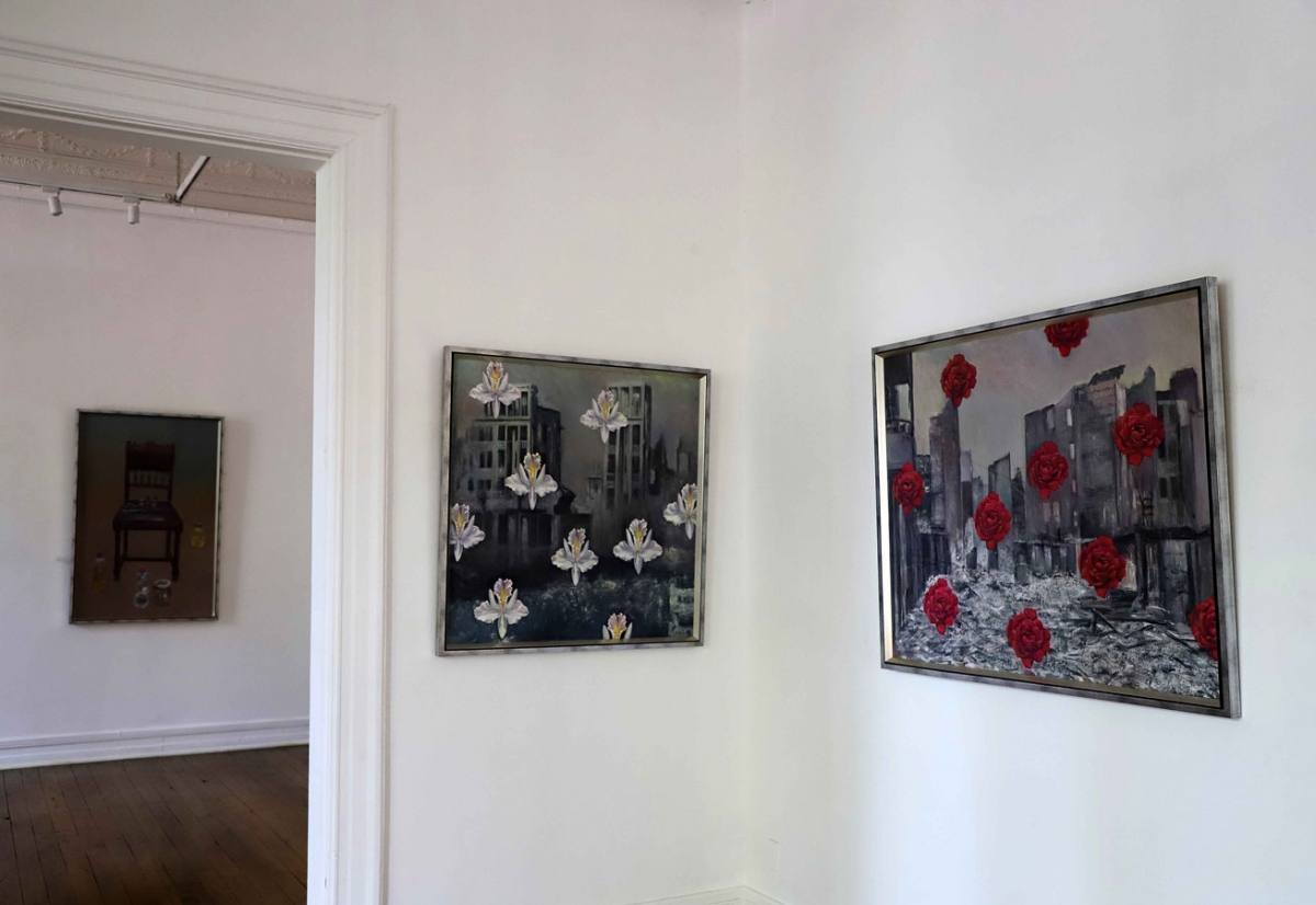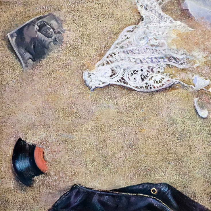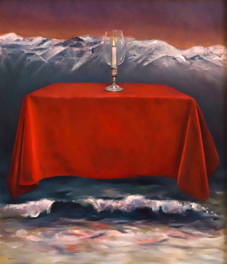 En “Latitud”, la artista pregunta por la identidad del paisaje desde un neorrealismo simbolista. La luz reverbera en símbolos que traducen la síntesis del espacio: la mesa en el paisaje, la copa de vino, la hoja de eucalipto, los objetos de la memoria esparcidos en la arena. En la muestra Subercaseaux revisita su trayectoria, retomando las telas, que datan de su última exposición en Chile en 1992, “Presencias” y vuelve a la superposición de los planos y de los tiempos, en un desborde de la vida cotidiana. La forma intacta y frágil de la flor sobre la ruina se reitera en “Latitud” sobre un paisaje devastado.