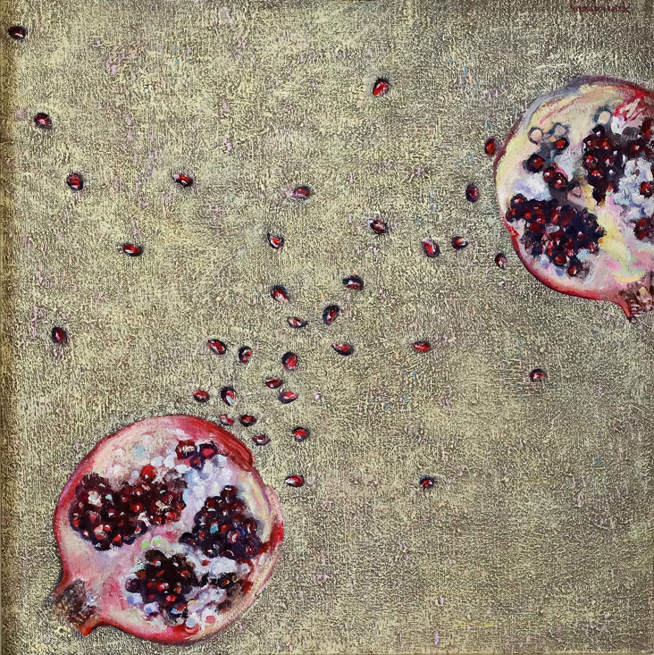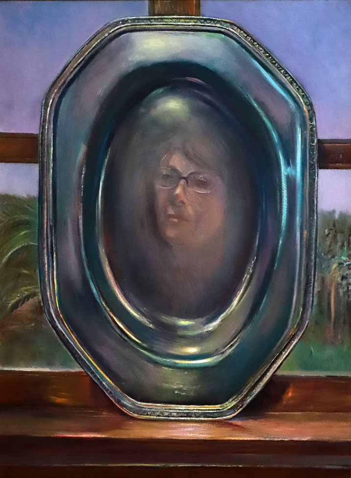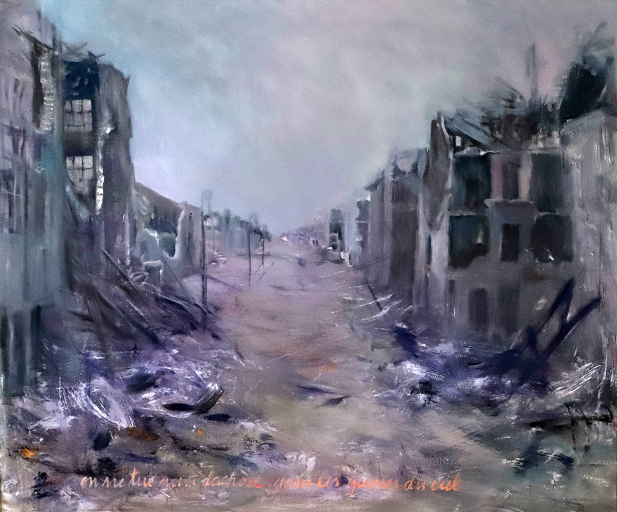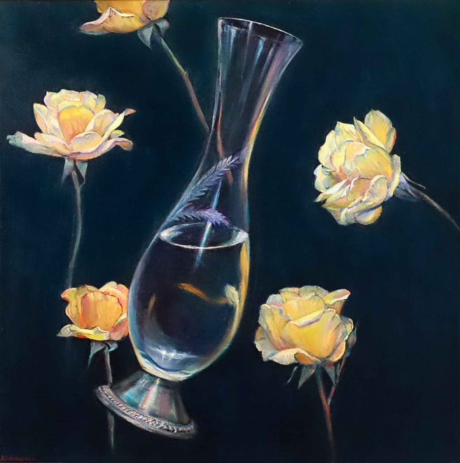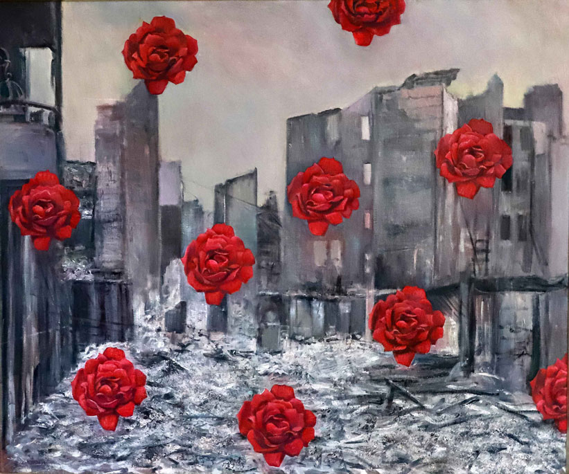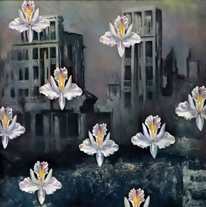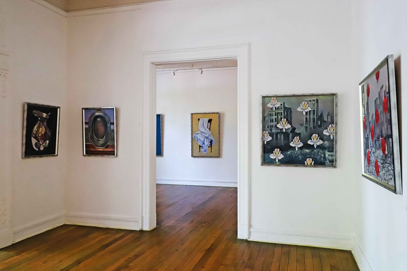 En “Latitud”, la artista pregunta por la identidad del paisaje desde un neorrealismo simbolista. La luz reverbera en símbolos que traducen la síntesis del espacio: la mesa en el paisaje, la copa de vino, la hoja de eucalipto, los objetos de la memoria esparcidos en la arena. En la muestra Subercaseaux revisita su trayectoria, retomando las telas, que datan de su última exposición en Chile en 1992, “Presencias” y vuelve a la superposición de los planos y de los tiempos, en un desborde de la vida cotidiana. La forma intacta y frágil de la flor sobre la ruina se reitera en “Latitud” sobre un paisaje devastado.