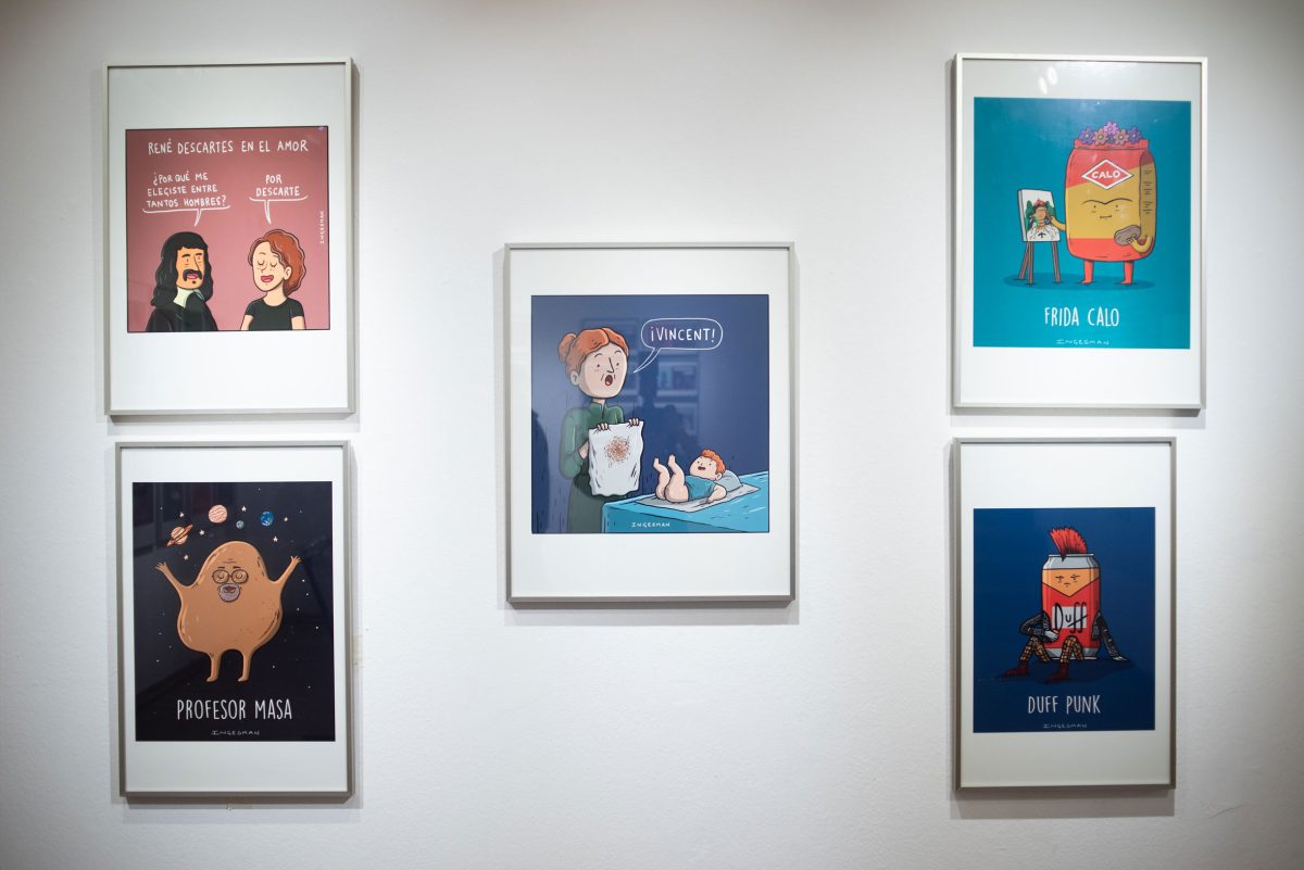 58 obras digitales impresas, y algunas en papel, destacan por su enfoque en el humor literal y el humor absurdo. La interactividad es un componente clave, con personajes ilustrados que guían a los visitantes a través de la exposición, compartiendo anécdotas y chistes que enriquecen la experiencia. Un espacio creativo de celebración del arte digital y tradicional, donde todas las edades pueden disfrutar de la singular visión del mundo de Ingesman.